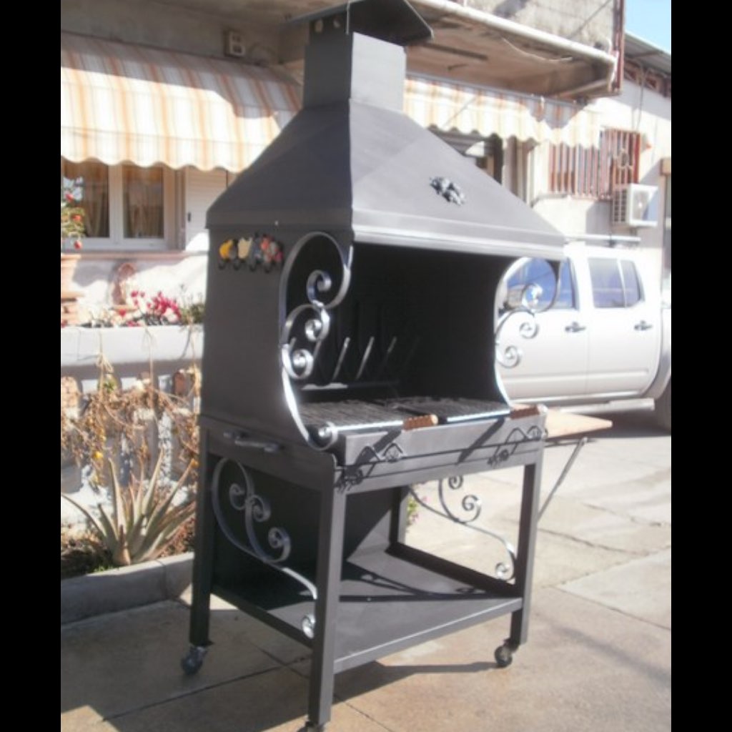 Barbecue domestico realizzato su base in ferro con lavorazioni in ferro battuto, per la legna ha un alare a terra che permette di far cadere il carbone sulla griglia mentre la cenere cade nel cassetto sottostante. Dotato di ruote per lo spostamento, ripiano sottostante, maniglie per il trasporto e ripiano a scomparsa laterale. Le misure di questo modello sono personalizzabili.