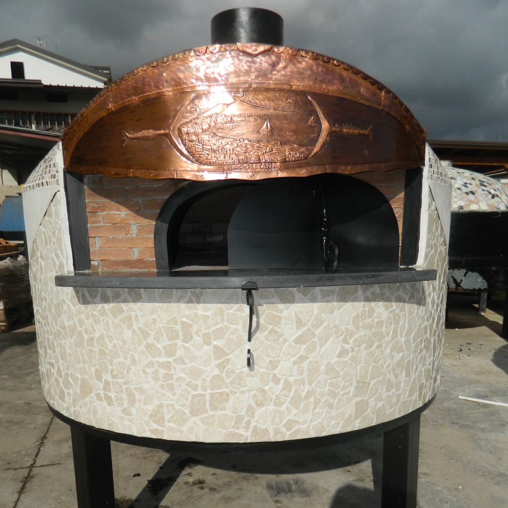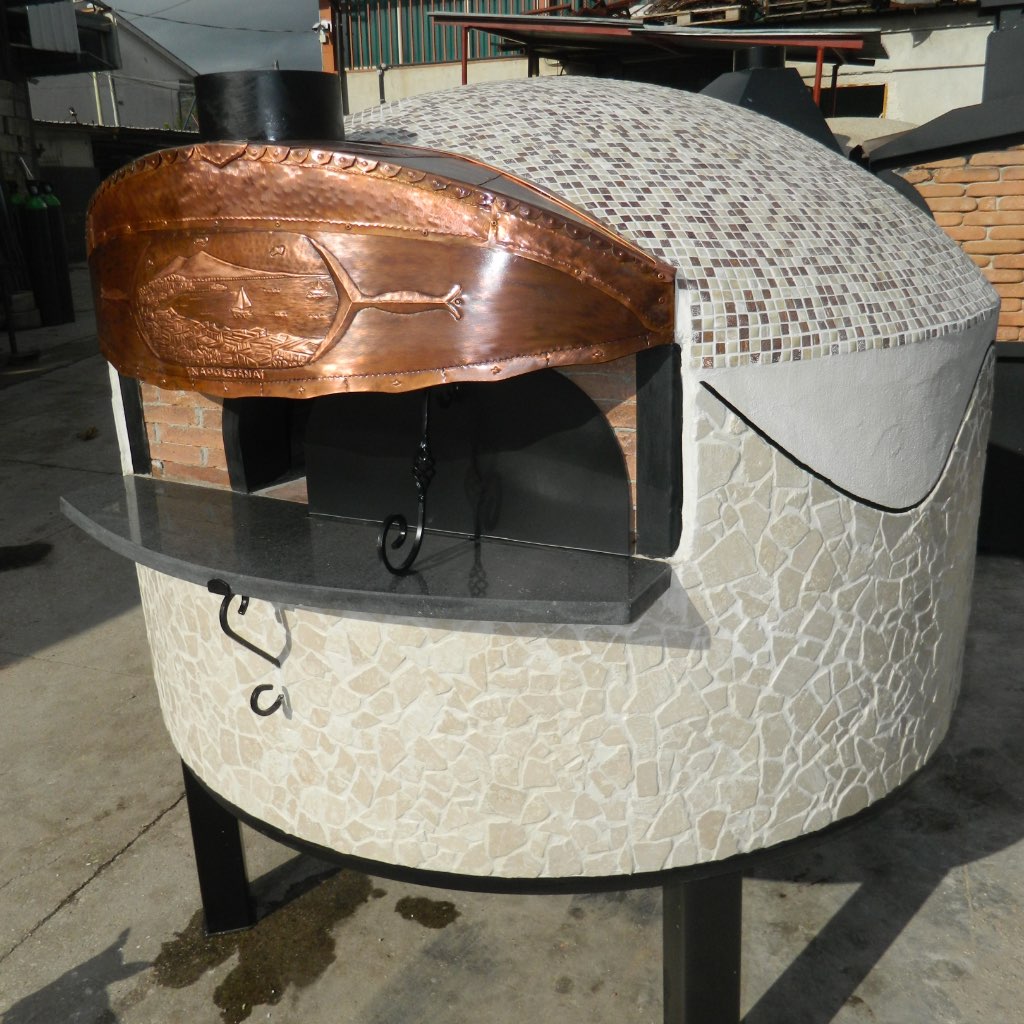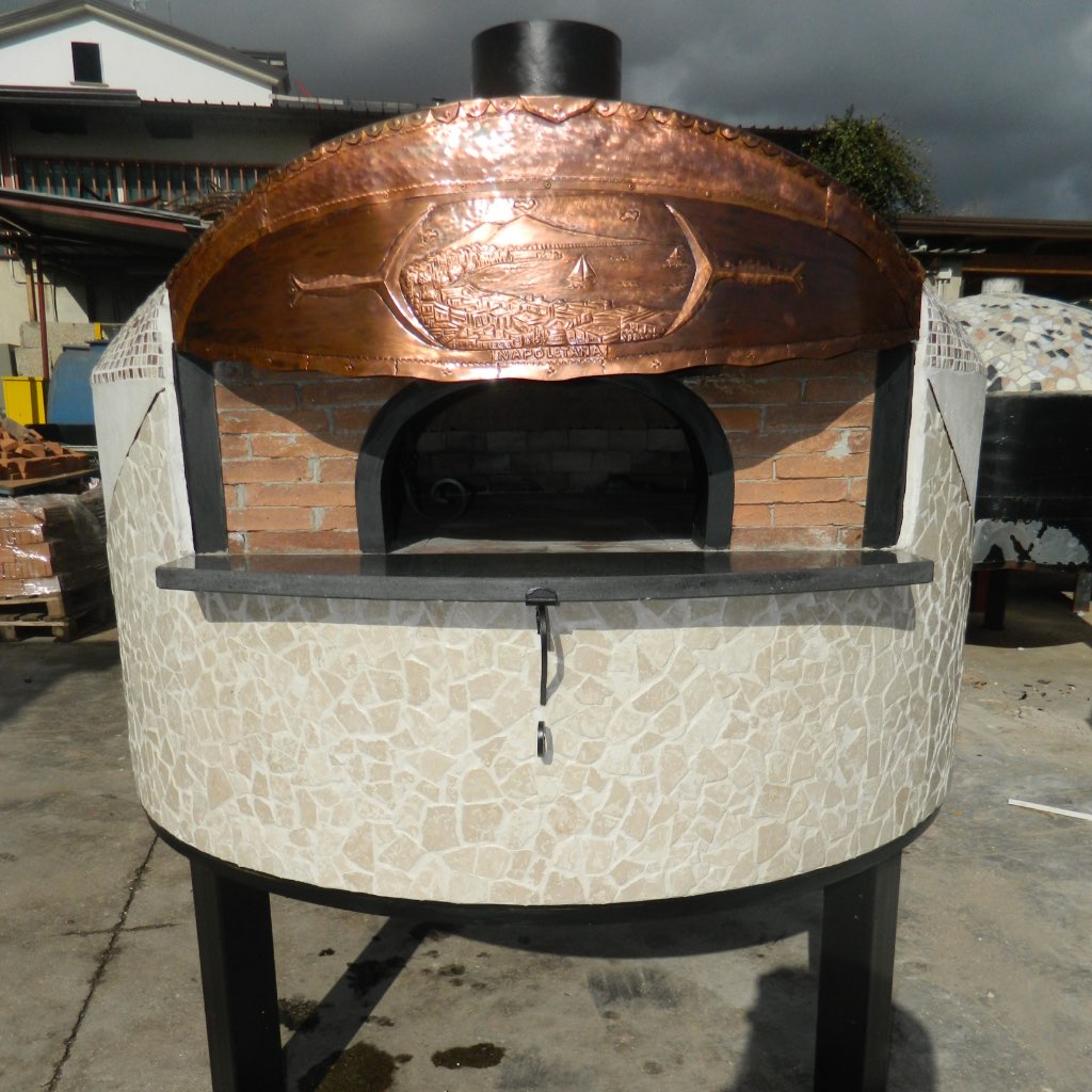 Forno professionale a legna, tondo su base in ferro, rivestito in pietra palladiana e cupola in mosaico con cappa in rame raffigurante il Golfo di Napoli.