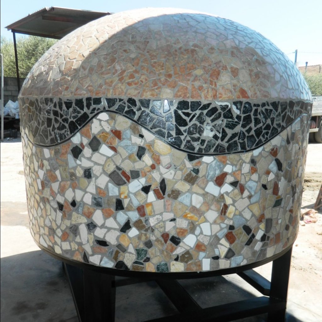 Forno professionale tondo cm.120 con base in ferro, rivestito interamente in pietra palladiana con cappa in ferro e davanzale in pietra lavica, a richiesta del cliente possibilità di personalizzazione con cappa in rame.